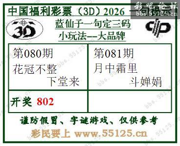 [彩吧]福彩3D26081期蓝仙子一句定三码字图谜